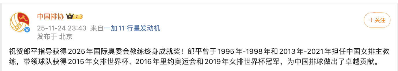北京时间24日晚,中国排协官方在社交媒体上发文,向郎平表示祝贺。“祝贺郎平指导获得2025年国际奥委会教练终身成就奖!郎平曾于1995年—1998年和2013年—2021年担任中国女排主教练,带领球队获得2015年女排世界杯、2016年里约奥运会和2019年女排世界杯冠军,为中国排球做出了卓越贡献。 ”